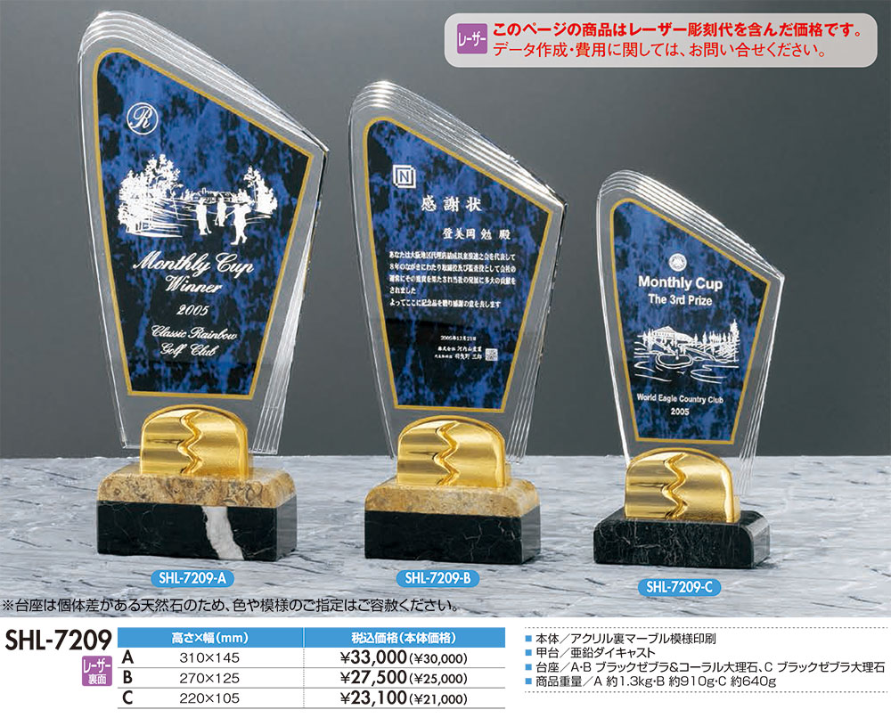 本体/アクリル製・亜鉛ダイキャスト製台座・大理石製・レーザー彫刻・納期約10日間