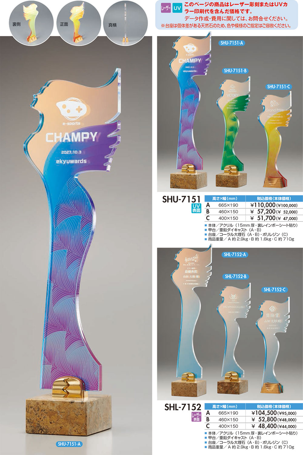 本体/アクリル製甲台/ダイキャスト製(A,Bのみ)台座/コーラル大理石(A,B)・ポリレジン(C)レーザー彫刻・納期約10日間UVカラー印刷・納期約15日間レーザー彫刻の場合アクリルは透明のみ