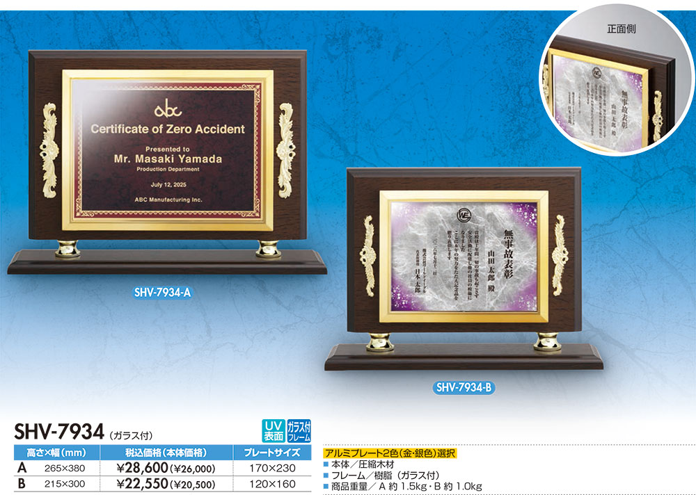 本体/圧縮木材フレーム/樹脂(ガラス付)アルミプレート(金・銀)UVカラー印刷・納期約15日間