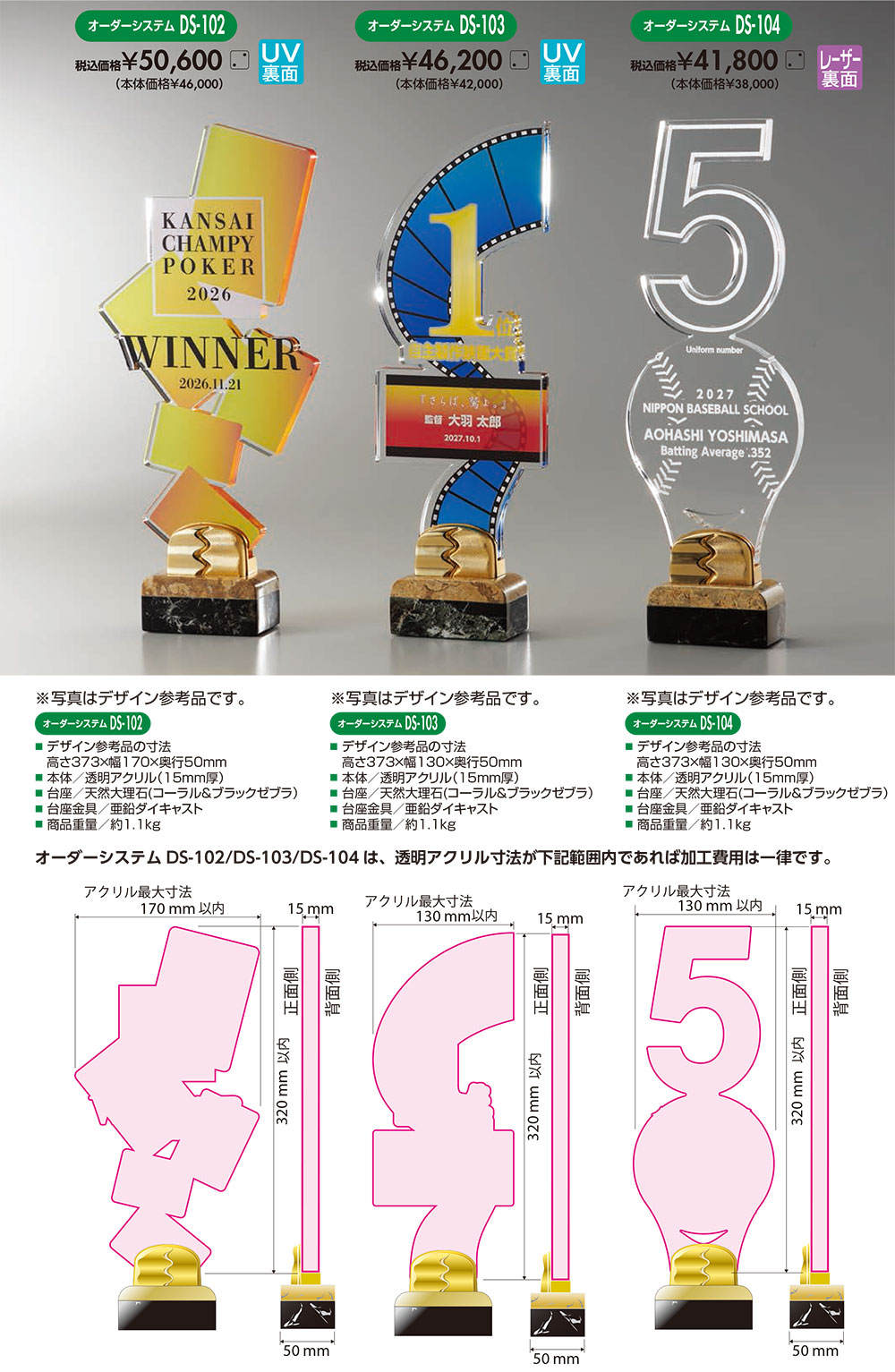 本体/透明アクリル製(15mm厚)台座/天然大理石台座金具/亜鉛ダイキャスト製アクリルにUV印刷加工レーザーカット加工デザイン校正OK後約3週間データをメールにて入稿して下さい